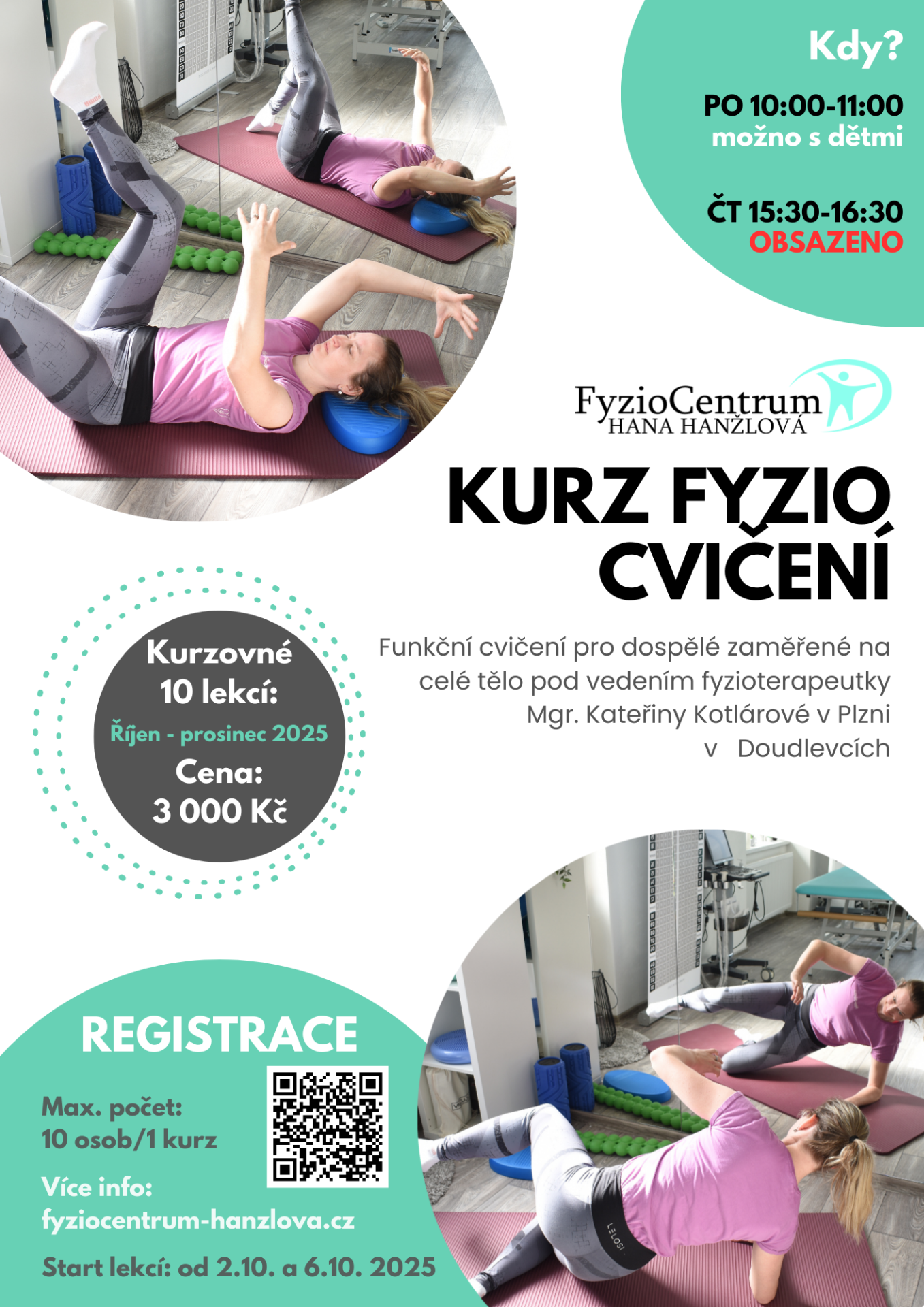 Dne 2.10.2025 a 6.10.2025 se opět rozběhnou oblíbené kurzy skupinového FYZIO cvičení metodou DNS dle prof. Pavla Koláře. (dynamická neuromuskulární stabilizace) pod vedením odborné fyzioterapeutky Mgr. Kateřiny Kotlárové.